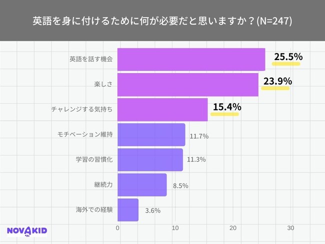 「英語を身に付けるために何が必要だと思いますか?」(n=247 )という質問をしたところ、「英語を話す機会」が25.5%で1位。次いで「楽しさ」が23.9%でした。子どもにとっては「楽しさ」も重要だと考える保護者の回答がほぼ同数という結果でした。