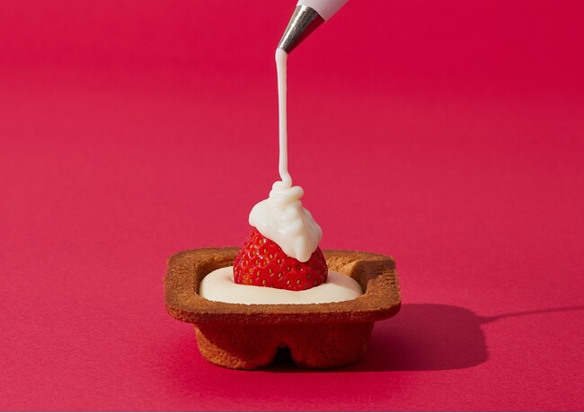 昨年ご好評いただいた「CHEESE WONDER RED 2023」同様、いちご生チーズムースと生チーズスフレの間に、フレッシュないちごを丸々閉じ込めました。製造に合わせて、その時期に最もぴったりな国産の苺を厳選して使用しています。