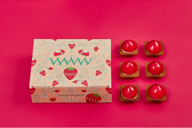 生チーズムースには北海道産いちごのペーストを混ぜ合わせており、爽やかな風味が広がります。いちごを閉じ込めた上にグラサージュをまとって真っ赤に染まったチーズワンダー。暖かくなる季節にぴったりの、甘酸っぱくまろやかな味わいです。