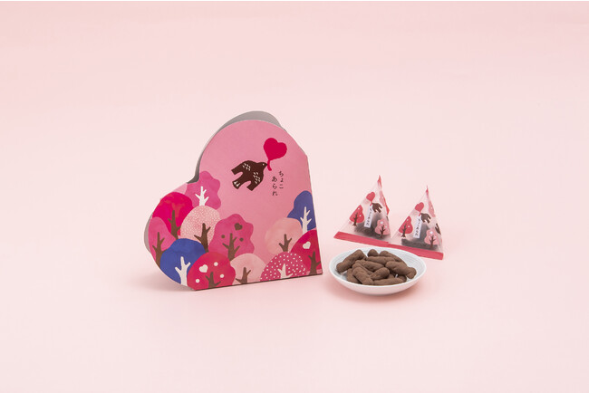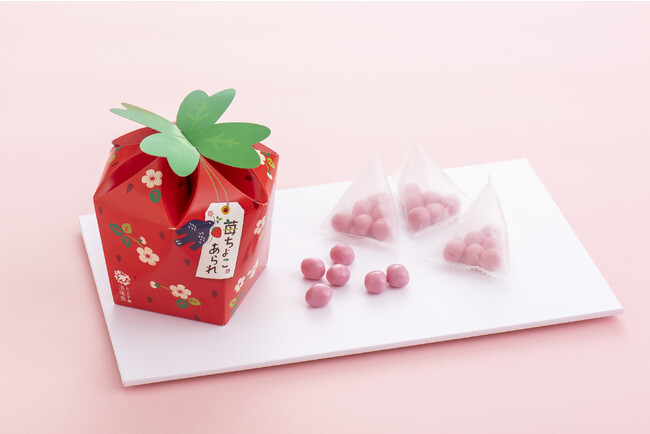 2023年で発売11年を迎える、“苺”をモチーフにした毎年人気の季節限定商品です。国産米を使用した小ぶりの丸型あられに淡いピンク色の苺風味のチョコレートをコーティング。見た目にも可愛らしく仕上げた、サクッと軽い食感のチョコあられです。苺型のパッケージは、手土産やちょっとしたプレゼントに、またバレンタインのお返しにも喜ばれています。『苺ちょこあられ』をほおばりながら、少し早めの春の味をお楽しみください。