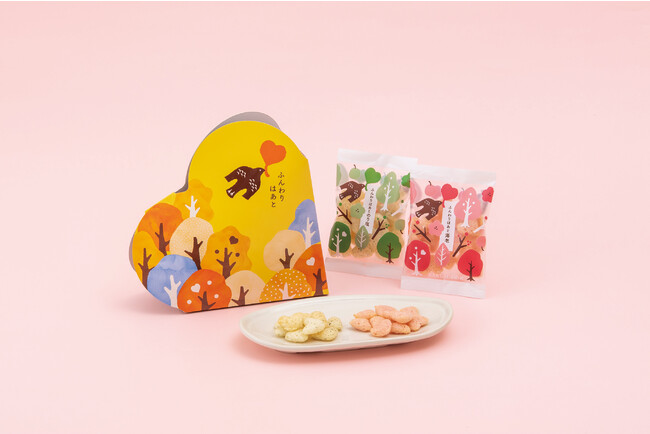 軽い食感が特徴のハート型あられです。海老を練り込んだ塩味とジャガイモを練り込んだのり塩味の2種類を詰め合わせました。商品名:ふんわりはあとアソート