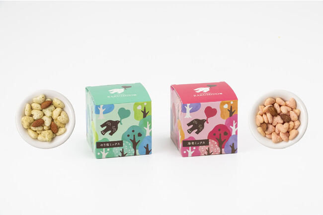 ジャガイモを練り込んだ生地にのり塩で味付けしたのり塩ミックスと、海老を練り込んだ生地にシンプルに塩で味付けした海老の風味香る海老ミックス。食感のアクセントにアーモンドをミックスしています。