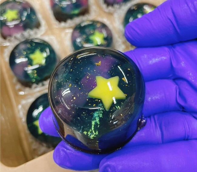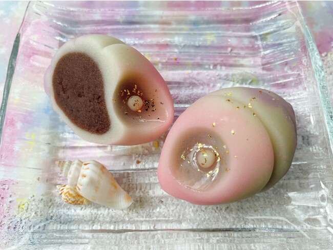 お亀堂の女性和菓子デザイナーが幻想的な、インスタ映えする和菓子を作りたいとの思いから開発しました。現代では和菓子離れが進み、和菓子をたべない若者が増えてきました。そのため、多くの和菓子屋は売り上げ低下のため、廃業や倒産のニュースが数多く報道されるようになっています。そこで、和菓子に親しみがない若者でも今どきのデザインで、心惹かれるものを作りたい・・