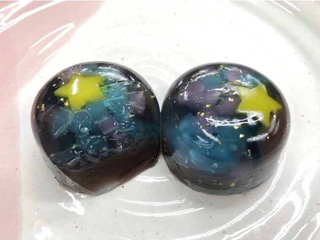 錦玉羹の中には黄色羊かんの星、中の寒天のピンク色や錦玉羮の青色、星屑のイメージの金箔でキレイな輝きとグラデーションを表現してます。中に小さい角切りの錦玉羹を入れることで、同じ錦玉羹でも食感の違いが楽しめるようになっています。一番下は水ようかんを流して、夜空の暗さを演出しています。