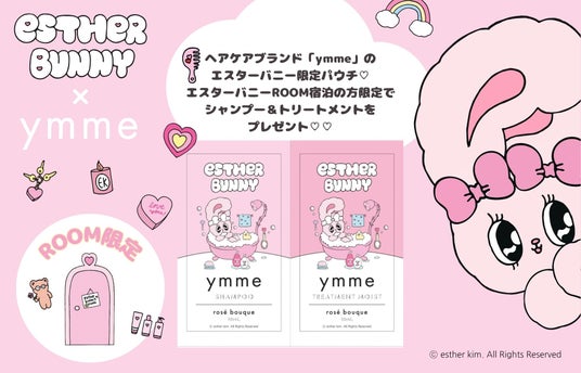 ピンクがテーマ!美容師がつくったサロンクオリティのヘアケアブランド「ymme(ワイミー)」は、人気急上昇中のキュートなうさぎのキャラクター「Esther Bunny(エスターバニー)」とのコラボレーションアイテムを2024年7月下旬(ホテルニューオータニ(東京)様のスケジュールに準ず)よりホテルニューオータニ×エスターバニーコラボレーションルーム「(ハート)esther bunny room(ハート)」限定でエスターバニーデザイン:シャンプー&トリートメントパウチをプレゼントいたします。