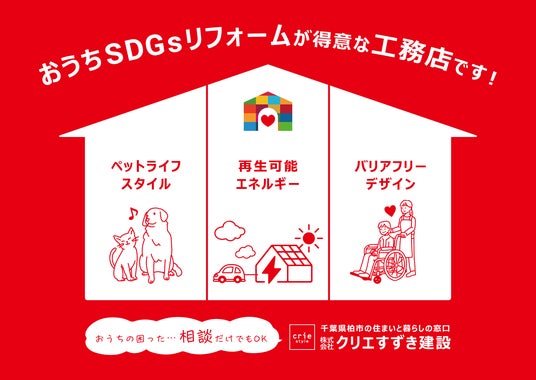 ペットライフスタイル、再生可能エネルギー、バリアフリーデザイン、おうちSDGsリフォームが得意な工務店です
