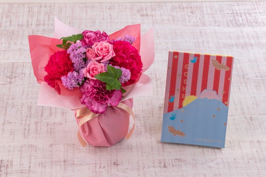 御朱印帳は、一富士二鷹三茄子といわれる縁起物をkichijitsuらしいポップなデザインにした「123」と、富士吉田市の街並みを想わせる富士山をバックにしたちどりデザインの「ちどり」の2種をご用意。御朱印帳のデザインに合うピンクの花々をメインに、日比谷花壇専属フローリストによる彩り豊かなブーケを組み合わせたギフトセットに仕上げました。