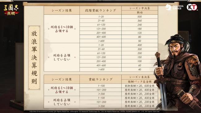そして今シーズンは、放浪軍の決算ルールも変わりました。シーズン終盤の決算時、放浪軍が一つ以上の州府を占領していることが大前提になり、貢献値順位の高い君主のみが決算報酬を獲得できます。もし放浪軍が州府を占領していない、かつ自身の貢献値順位が低い場合には、歴戦報酬しか獲得できませんので、挙兵して放浪軍になるかどうかを、しっかりと判断してください。