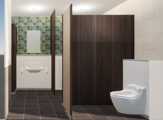 明るく清潔感のあるトイレにリニューアルするとともに、十日戎の福笹や今宮戎神社の青銅色をイメージしたタイルを採用し、やわらかく落ち着いた空間にまとめました。
