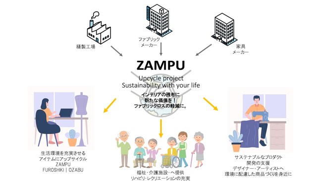 「小さいけれど、まだまだ役立つ道があるのでは?」と、残布に着目した私たちの想いから、このプロジェクトは始まりました。当初の役目は果たしたけれど、こだわりの生地だからこその品質は、捨てるにはまだ早すぎます。新たないのちを吹き込むため、これらを「ZAMPU(ざんぷ)」と名付け、インテリアデザイン事務所ならではのコーディネート力で、アップサイクルしています。