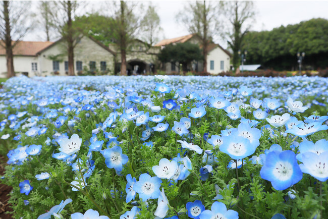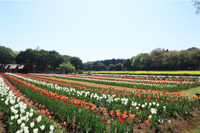 「こもれび森のイバライド」にて、春の開花をお伝えいたします。約5,000平方メートル の広大な花畑に、ネモフィラ、チューリップ、菜の花が咲き、来園者を楽しませています。