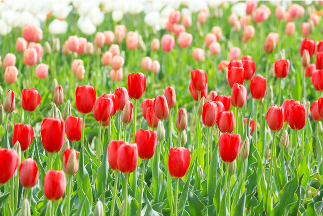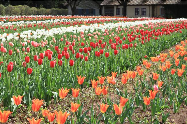 また向かい側では、約2万本の4色4品種のチューリップが、一直線に並び圧巻の景色となっております。越冬した球根から、たくましく育ったカラフルなチューリップです。