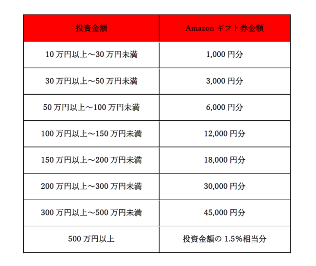 当ファンドに10万円以上ご投資いただいたお客様に、投資金額に応じたAmazonギフト券をプレゼントいたします。