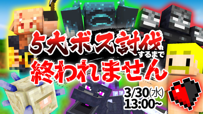 ドズルがゲーム「Minecraft」に登場するボスモンスター5体を討伐するまで終われない生放送を行います。