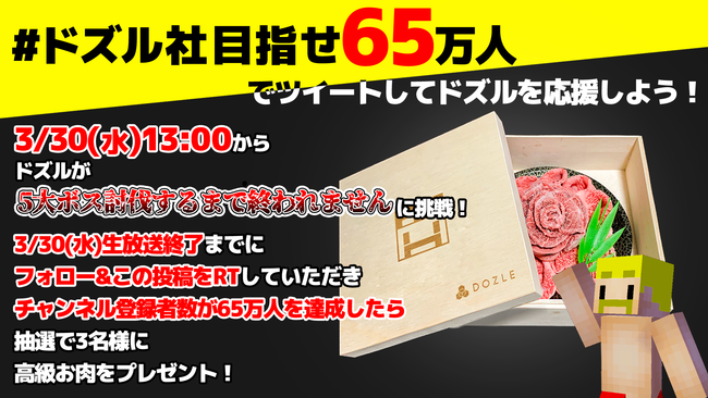 ドズル社チャンネルの登録者数が65万人を達成したら抽選で3名様に高級なお肉をプレゼント!