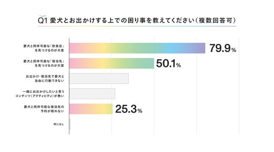 「愛犬とお出かけする上での困り事を教えてください」の問いに対して、79.9%が「愛犬と同伴可能な飲食店を見つけるのが大変」、50.1%が「愛犬と同伴可能な宿泊先を見つけるのが大変」、25.3% が「愛犬と同伴可能な宿泊先の予約が取れない」と回答しており、お出かけ先自体を見つけることが難しい上、「車を持っていないため移動手段がない」との回答もあり、移動方法も含めてハードルが高いことが伺えます。