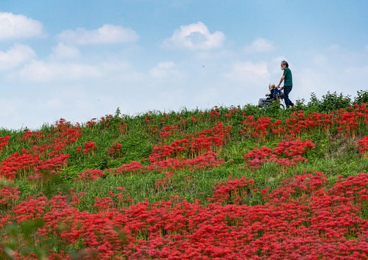 老々介護者が土手に彼岸花がいっぱい咲く道をのんびり散歩するある晴れた一日でした。