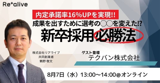 今回は、例年採用イベントで多くの実績を出しているテクバン株式会社様に登壇いただき、新卒採用の必勝法をお話しいただきます。