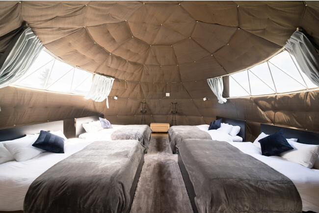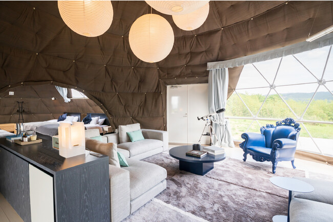 お部屋は、自然との一体感とラグジュアリーなひとときの両方をお楽しみいただけるよう、リビングと寝室を分けて設計したツインドーム。スタンダードルームは「6m+7m」、スイートルームは「7m+8m」のツインドームを採用し、いずれも国内最大級の広さを誇ります。ゆったりと寛げるソファはもちろん、全室スクリーンも完備。夜にはルームシアターもお楽しみいただけます。