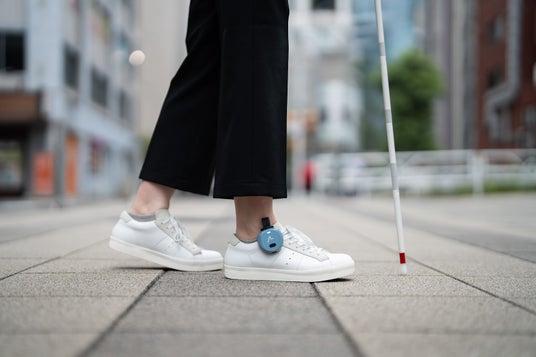 あしらせを装着した靴を履き白杖を持った男性が点字ブロックの上を歩いている様子