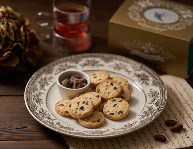 ディアマンバニーユに、チョコレートチップ、カカオニブの香りと食感を加えた、よりリッチなクッキーです。お子様から大人の方まで、どんな年代の方にも好かれる美味しさのクッキーに仕上げました。