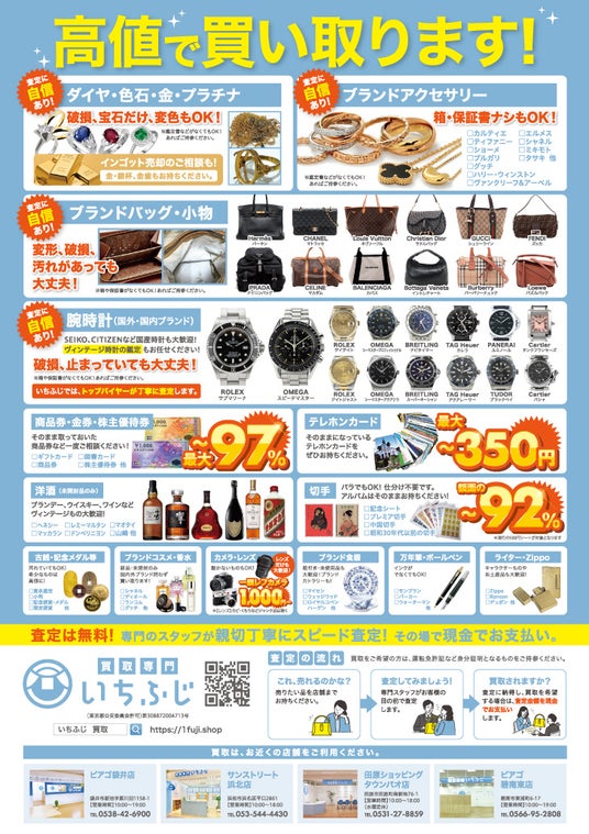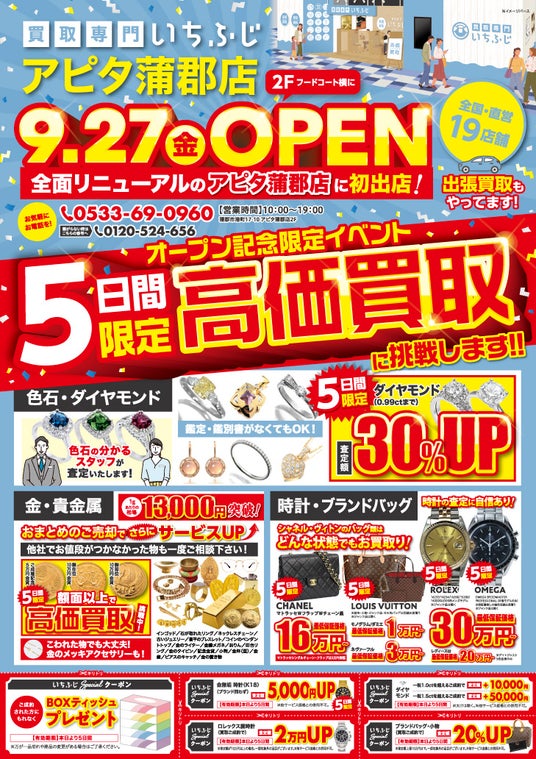 「買取専門 いちふじ」アピタ蒲郡店では、オープンを記念して、期間限定でブランド品や貴金属などの買取額を通常より20%アップするキャンペーンを実施いたします。この機会にぜひお手元のブランド品をお持ち込みいただき、高価買取をご体験ください。