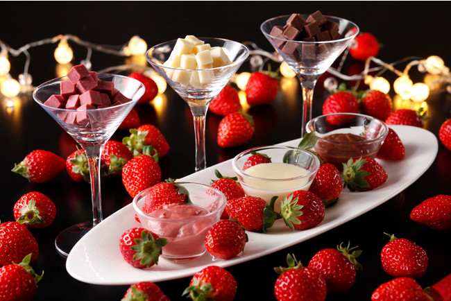 明治のいちごフレーバーの商品を中心に、産地や品種の異なるカカオの個性を最大限引き出した『明治 ザ・カカオ プロフェッショナルズ』(*)などをアレンジし、チョコレートとのマリアージュをコース仕立てでご提供いたします。レモンの酸味と苦みを表現した『彩味<レモン>』(*)に苺味をしっかりと味わえる『アポロ my style』をトッピングした「フォワグラのムース ストロベリーソース」などを含む料理長の特製オードヴルからメイン料理の「牛肉の赤ワイン煮」やスイーツまで、心ゆくまでご堪能ください。フレッシュいちごの食べ放題には、明治のチョコレートを使用したミルク、ホワイト、いちごの3種類のチョコレートソースをご用意し、利きチョコレート感覚で味わいの違いを楽しむのもおすすめです。さらに、バレンタイン気分をより盛り上げるウェルカムドリンクは、明治のチョコレートを使用したバーテンダー考案のスペシャルカクテルをご用意いたします。いちごを存分に使用したスイーツとともに、シェフやパティシエがいちごと相性の良いチョコレートをアレンジした特別料理やスイーツをお楽しみいただけます。