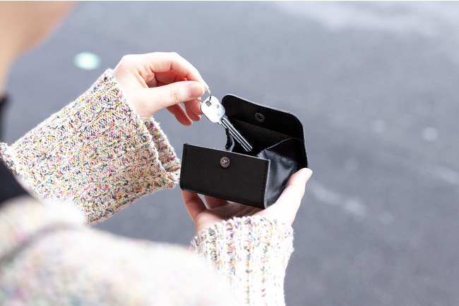 コインはもちろん、鍵や、花粉シーズンには嬉しい目薬ケースやピルケースのような使い方まで。マルチな使い方をできるように、サイズ感を徹底的にこだわり調整。いくつものサンプルを作成しながら革小物を作り続ける国内の工場とアイデアを出し合いながらものづくりを進めました。