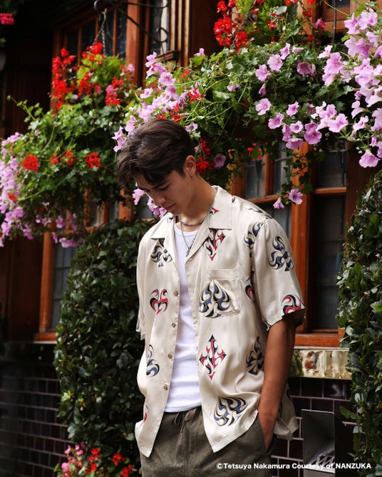 落ち感のある生地感が特徴のレーヨン素材を使用したオープンカラーシャツ。身頃全体にハンドで擦った風合いのトランプの柄からインスパイアされたモチーフをモノグラム調にプリントで配置、ポケットや切り替え箇所も柄合わせをした手の込んだデザイン。両胸にパッチポケット、第一ボタン留めはクラシックなルーパー仕様。身幅にゆとりのあるシルエット。1色S~XLサイズ展開。¥38,500(Tax.in)