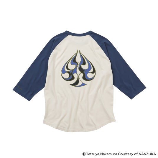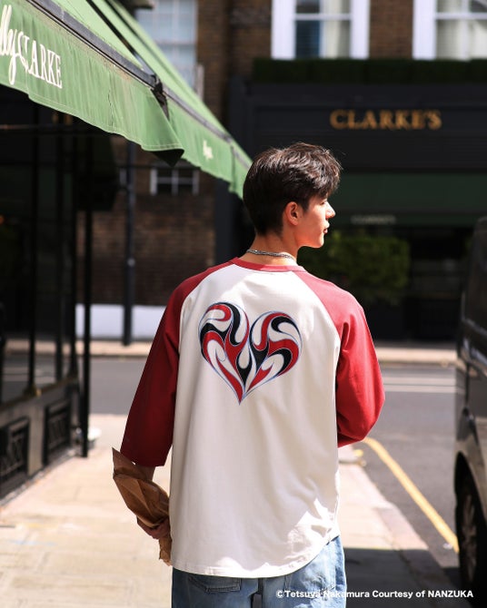 9.1oz.の厚みのあるコットン天竺素材を使用したオリジナルボディのラグランスリーブTシャツ。左胸・背面にトランプの柄からインスパイアされたモチーフをクラックプリントで表現したデザイン。袖丈は7分丈、襟・袖を身頃と配色を切り替え、裾はラウンドカット仕様。レギュラーフィットシルエット。2色S~XLサイズ展開。¥16,500(Tax.in)