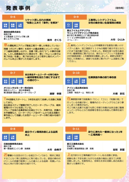 今大会では、事務・間接部門はもちろんのこと、一般的には女性比率が高くない製造現場の改善事例など、20社の先進企業による全44事例の発表が一挙に集結します。