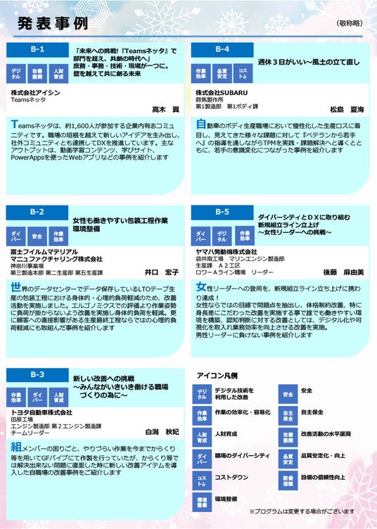 発表の聴講だけでなく、先進企業との交流によって、モノづくり現場のダイバーシティ化の推進の一助として活用いただければと思います。