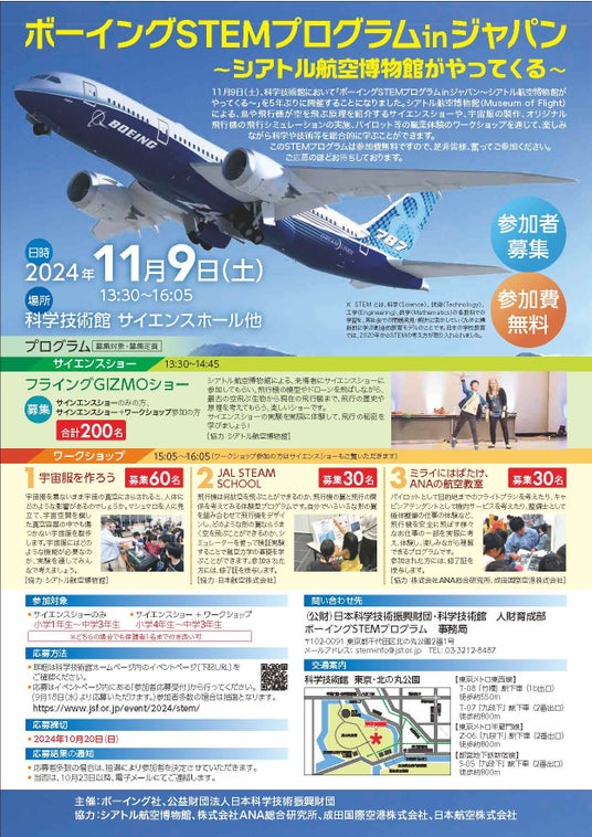 11月9日(土)、科学技術館において「ボーイングSTEMプログラム in ジャパン~シアトル航空博物館がやってくる~」を5年ぶりに開催します。シアトル航空博物館による、鳥や飛行機が空を飛ぶ原理を紹介するサイエンスショーや、宇宙服の製作、オリジナル飛行機の飛行シミュレーションの実施、パイロット等の職業体験のワークショップを通じて、楽しみながら科学や技術等を総合的に学ぶことができます。