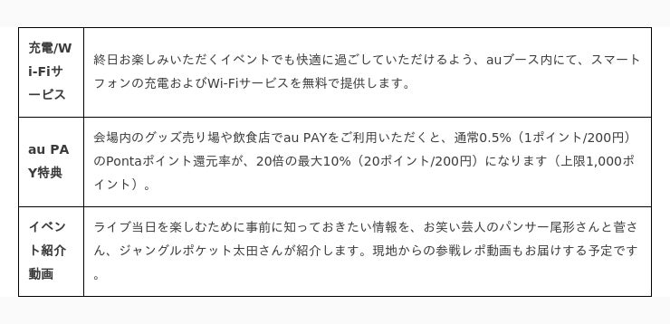 無料の充電/Wi-Fiサービス利用やフォトスポット撮影ができるブース出展のほか、会場内のグッズ売り場や飲食店におけるau PAYの最大20倍(20ポイント/200円)還元キャンペーンなどを実施します。