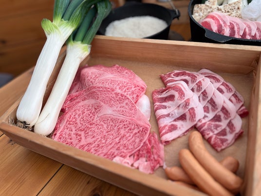 さらに、群馬県産福豚の肩ロースとポークソーセージもご用意。群馬の味覚が詰まったお重をすき焼きと共にご堪能ください。