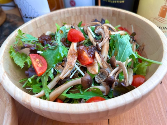 地場産フレッシュサラダにこんがり焼いたしめじとトマトを贅沢にトッピング。
