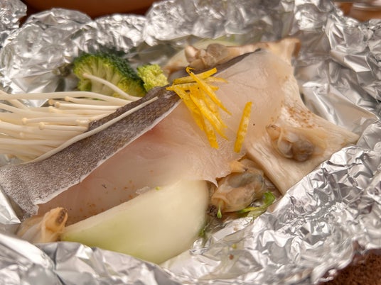 大ぶりな鱈を主役に、アサリ・エリンギ・エノキ・ブロッコリー・玉ねぎの6種素材を和風だしで味付けしました。アルミホイルに包まれた状態で焼き上げることで、素材本来の旨みをぎゅっと閉じ込め、そのままでももちろん、お酒にも合う仕上がりに。仕上げの香り付けに柚子を添えました。