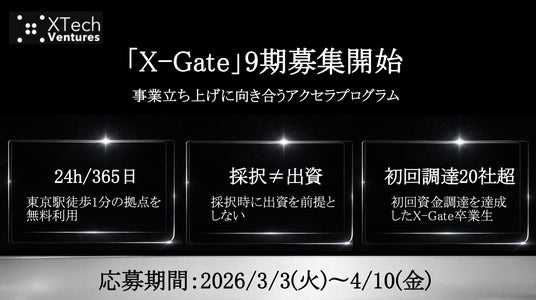 XTech Venturesが運営する東京駅徒歩1分のシェアオフィス『xBridge - Yaesu(クロスブリッジ八重洲)』にて、創業支援・事業伴走を行うアクセラレーションプログラム『X-Gate(クロスゲート)』、本日より第9期の参加者の募集を開始いたします。本プログラムは、多数の新規事業立ち上げや上場企業の経営経験を持つ代表パートナー陣をはじめ、XTech Venturesのメンバーを約4ヶ月間にわたり「出資検討の前段階から」存分に活用いただけるものです。「まずはVCの知見を借りたい」「事業の解像度を極限まで高めたい」という、起業準備中や起業直後の方々の挑戦をお待ちしております。