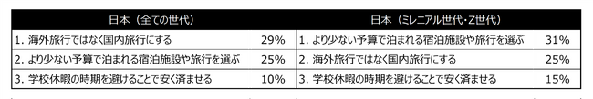■低予算で旅行するために工夫 - 日本のミレニアル・Z世代(本調査結果の分析においては1981年~2012年生まれ)の回答者は、物価高の影響を受けて31%が「より低予算の宿や旅行先」を選び、15%が「学校などの休暇期間と旅行時期をずらす」と回答しています。これは日本の回答者の全体平均と比べて、それぞれ5ポイントほど高い結果でした(図表3参照)。