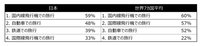■国内旅行への偏重傾向、物価高や円安も影響か - 日本人が2023年に予定している旅行先TOP10について 聞いたところ、上位から順に「日本国内」が1位、次いで「米国本土」、3位が「ハワイ」という結果でした。今年旅行に 出かける際に利用予定の交通手段についても、上位3位が「国内線(59%)」、「車(48%)」、「鉄道(39%)」であったのに対し、「国際線」は33%にとどまりました。「国際線」は調査対象7カ国平均の57%と比べても低い結果と なりました。(図表2参照)