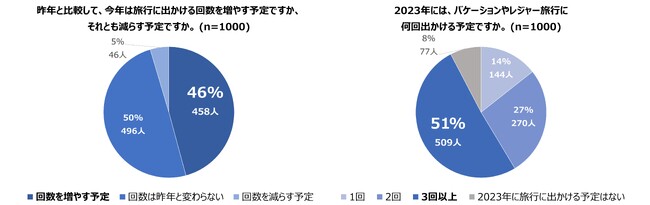 ●日本の回答者の約半数となる46%が2023年は昨年よりも旅行回数を増やす意向。