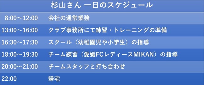 目まぐるしく変化するキャリアの中で、派遣社員として仕事を転々とすることもあったと語る杉山さん。コーチングライ センス取得のための勉強をしたいがなかなか時間が取れない、期限付きの雇用形態で安心感を持ちながら働くことが出来ないなど、自身のキャリアに悩みを抱えていました。その後ProVisionに入社し、現在はフルリモートで仕事をしながら、「愛媛FCレディースMIKAN」のU-18コーチを務めています。平日の午前中に会社の業務を行い、午後はチーム練習やスクールの指導にあたっています。