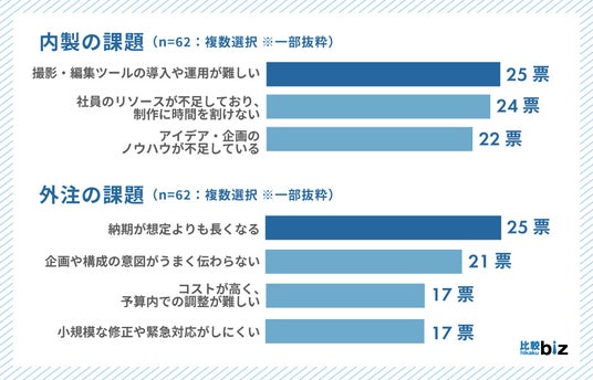 株式会社ワンズマインド(本社:東京都新宿区、代表取締役:尾池 徹哉)が運営する比較ビズと株式会社AtoOne(本社:東京都渋谷区、代表取締役:松下 勇介)が運営するMteam(Mチーム)は、動画マーケティングの内製と外注の課題に関して共同で調査を行いました。