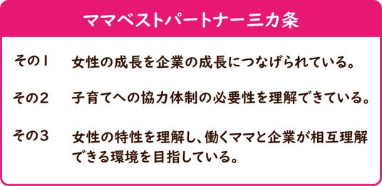 当社は、ママベストパートナーとして認定される上で、1)女性の成長を企業の成長に繋げる、2)子育てへの協力体制の必要性を理解、3)女性の特性を理解し、働くママと企業が総互理解できる環境を目指している。という3つの必要項目をクリアし、ライブ副業でのシングルマザーの経済的自立支援が評価され、本認定を取得しました。