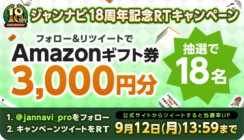 2022年9月2日でサービス開始18周年を迎えるオンライン麻雀ゲーム「ジャンナビ麻雀オンライン」Twitter公式アカウントにて抽選でamazonギフト券3000円分を18名様にプレゼントするキャンペーンを9月2日12:00より実施いたします。