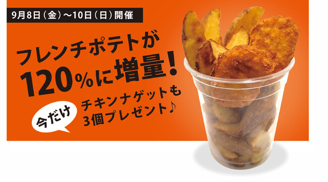 「北海道じゃがいもフレンチポテト」が120%に増量!さらに、チキンナゲットが3個もついて、お値段そのまま、1個240円(税込)でご提供いたします。