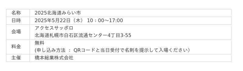 橋本総業株式会社(本社:東京都、代表取締役 阪田貞一)は、管工機材および住宅設備機器の総合展示会である「みらい市」の第一弾として、「2025北海道みらい市」を本年5月22日(木)に札幌市白石区のアクセスサッポロで開催します。なお「2025北海道みらい市」を皮切りに、今年も九州、中部、中国、東京で順次「みらい市」の開催を予定しています。