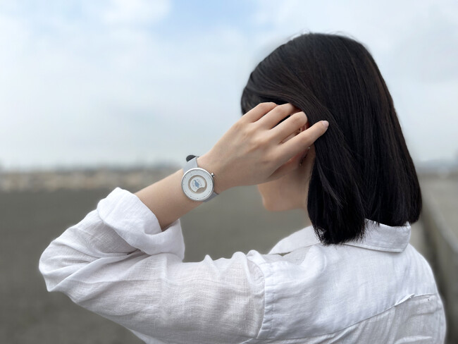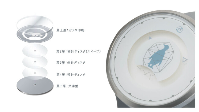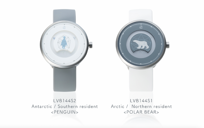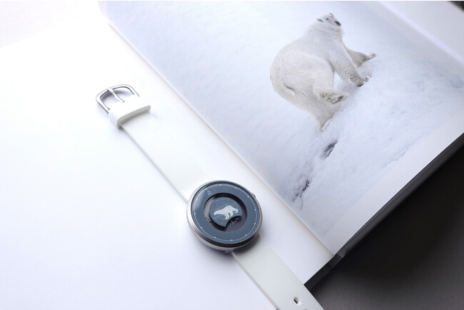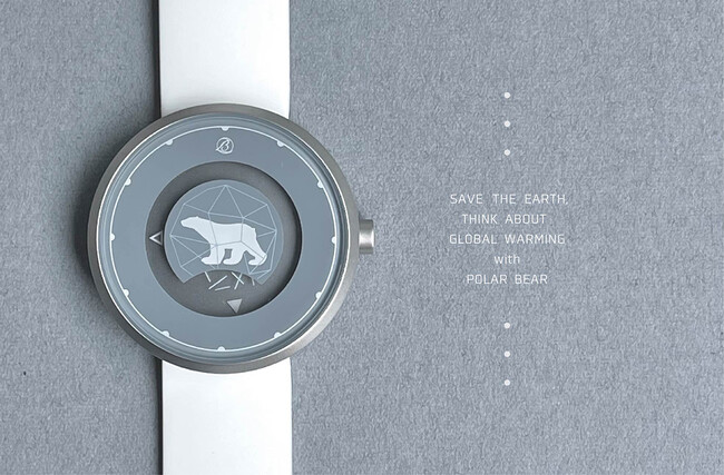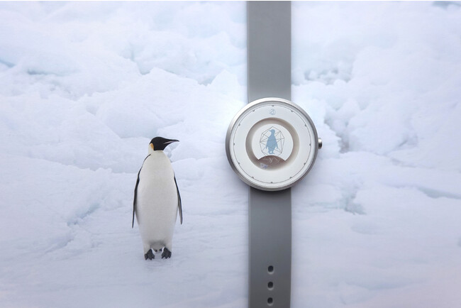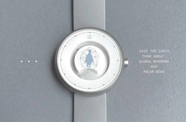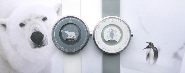 そのテーマを題材に「氷」に守られているホッキョクグマとペンギンのアイコンを、象徴的にグラフィックデザインで表現。彼らの存在、彼らの住む場所が永遠に消えてしまわないように…と願いが込められた、メッセージ性のあるデザインへと仕上げています。更に時計の構造に特化した株式会社マルゼキの提案・協力により、「氷」をイメージした秒針部分のグラフィックが動くようになっています。