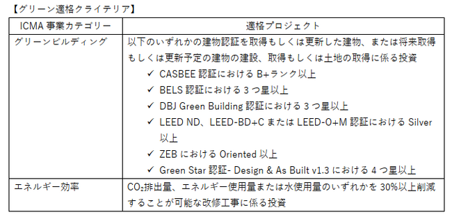 グリーンファイナンスで調達された資金は、新規投資または既存投資(リファイナンス)に充当を予定しており、以下に定める適格クライテリアを満たすプロジェクトに充当する予定です。