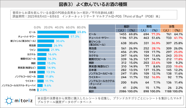 株式会社mitoriz(本社:東京都港区、代表取締役社長:木名瀬博)は、消費者購買行動データサービス「Point of Buy(R)(以下、POB)」の会員3,008人に「お酒に関する調査」を実施致しました。